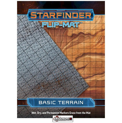Worlds of AdventureAn alien landscape, an abandoned space station, the twisting corridors of your own starship - the possibilities for adventure are endless with Starfinder Flip-Mat: Basic Terrain! Designed for the Starfinder Roleplaying Game but appropriate for any RPG, this invaluable gaming accessory presents two subtle textures - dusty ground on one side and metal floor plating on the other - providing Game Masters a blank canvas on which to draw any terrestrial battlefield, space-age facility, or adventure set piece they desire. Whether your party is facing down a convoy of ratfolk scavengers or breaking into a robot prison on a machine planet, you'll always have the right map at hand.